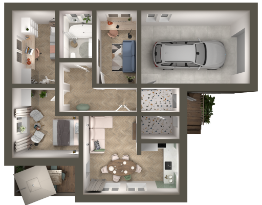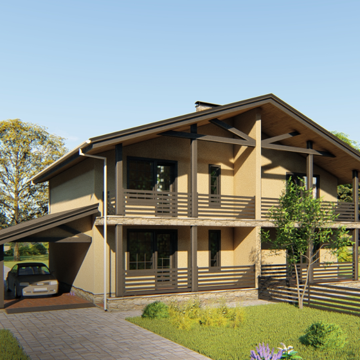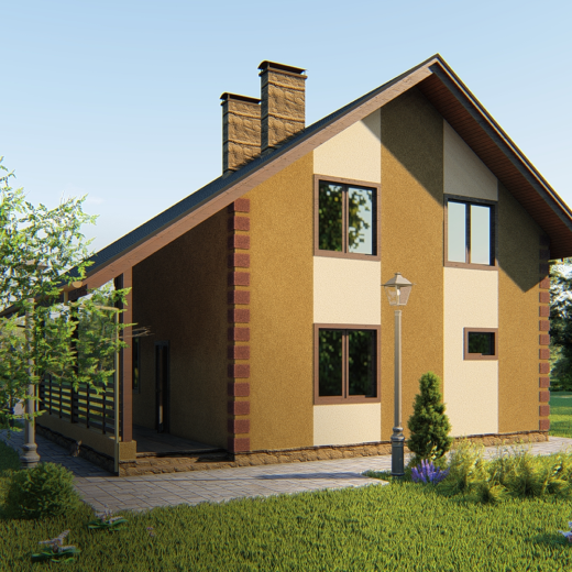 За основу взят проект «Нартекс», в котором была изменена планировка внутренних помещений: 2 большие спальни (14,5 и 19,5 м2), просторная кухня-гостиная, ванная, техническое помещение, терраса и гараж.